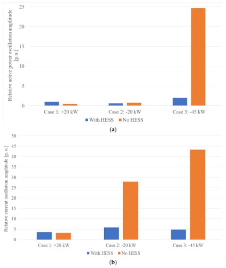 Furthermore, Figure 11b shows the relative current oscillation amplitude, evaluating it as a , where represents the difference between the maximum and minimum current values during the transient, while is the effective value of the phase A of the current at the stabilization after the transient. A strong difference of the relative current oscillation amplitude is clear, as depicted in Figure 11b, showing that HESS integration enables a reduced ratio of the evaluated parameter at the PCC, with greater benefits increasing the power step at the WEC terminals. Thus, a smoother interaction with the grid is remarked when compared with the no-storage conditions.