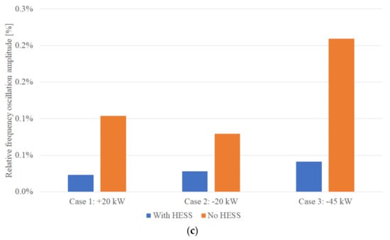 Finally, the relative frequency oscillation amplitude is depicted in Figure 11c. This quantity is evaluated as the ratio between the frequency oscillation amplitude and the nominal value (i.e., 50 Hz) achieved after stabilization, , where . Comparing the storage/no-storage conditions, it is evident that the ESS (in particular HESS) integration ensures a considerably smoother frequency behavior in dynamic conditions at PCC.