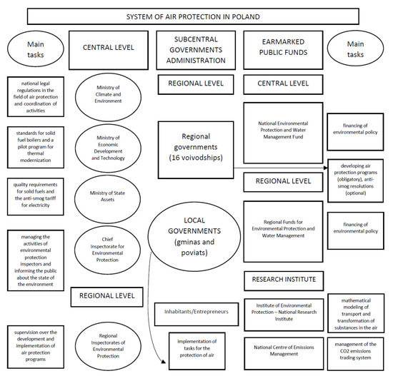 Taking into account the level of subcentral governments, the important role of regional governments (voivodeships) and local governments (poviats and gminas) should be emphasized. Regional governments are responsible for developing special air protection programs, while local governments are entrusted with the implementation of the tasks indicated in these programs [30]. In the Polish air protection system, the important role of the Environmental Protection and Water Management Funds must be highlighted both at the central level (National Fund for Environmental Protection and Water Management) and at the regional level (Regional Funds for Environmental Protection and Water Management). The main tasks of these funds include financing the country’s environmental policy [24] (p. 73). The system described above is presented in Figure 1.