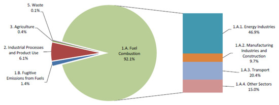 CO2 emissions in Poland arise mainly from fuel combustion (1.A subcategory in Figure 2). This sector accounted for 92.1% of the country’s total CO2 emissions in 2019. The shares of the main subcategories were as follows: energy industries—46.9%, manufacturing industries and construction—9.7%, transport—20.4%, and other sectors—15.0%. Industrial processes were responsible for 6.1% of the CO2 emissions in 2019, with the mineral industry as the main source of emissions in this sector. All these areas must be addressed to achieve carbon neutrality by 2050, primarily by increasing energy efficiency and switching from fossil fuels to zero-emission energy sources (including electricity, hydrogen, and ammonia) [31] (p. 6).