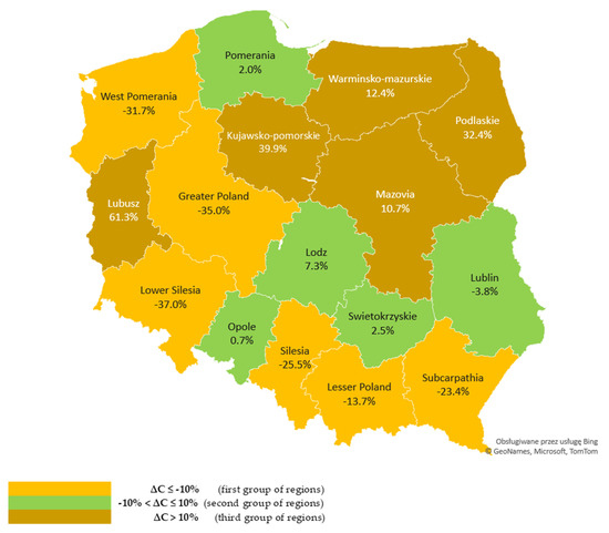 Figure 3 shows the relative cumulative percentage change in CO2 emissions (∆C) in Polish regions from 2010 to 2019 (in relation to 2010 levels). On this basis, the regions were classified into three groups, as follows: