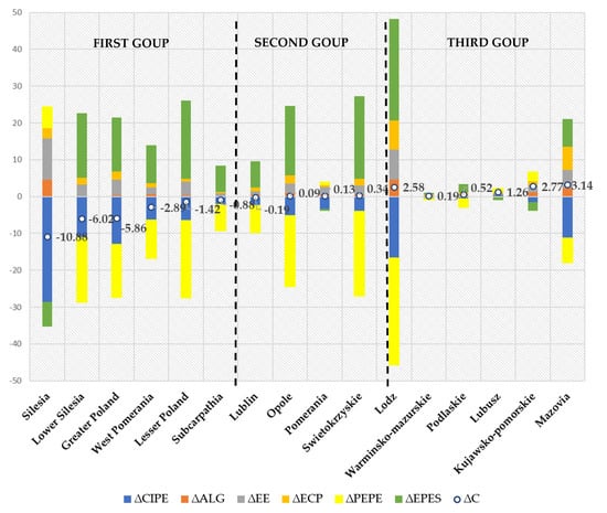 The last expenditure effect, ∆EPES was a positive factor in promoting CO2 emissions in all the regions, except for Silesia, where it had a negative effect. This is surprising as the average share of public environmental spending increased between 2010 and 2019 in all regions of the first group. In contrast to ∆PEPE, ∆EPES showed that environmental expenditure contributes to CO2 emissions arising from any (and not only directly population-related) sources, including the power generation, industrial, and transport sectors. ∆EPES was positive in all surveyed regions except for Silesia