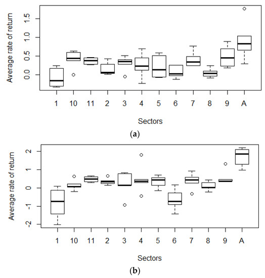 To depict the differences between the average weekly rates of return among the analysed stock market sectors for both the entire research period and for two sub-periods, box plots are presented in Figure 2.