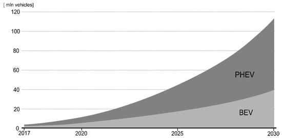 The COVID-19 pandemic in 2020 for the overall global automotive market had a special impact due to a global decline of 16% in passenger car sales compared to 2019 [40]. Despite the declining situation in the broader market, electric car sales in 2020, as in previous years, grew sharply, increasing the number of newly registered charged electric cars (BEV + PHEV) by 43% compared to 2020, representing approximately 3 million new electric cars worldwide. The total number of registered electric cars on the road worldwide at the end of 2020 was approximately 10.1 million. The largest number of electric passenger cars was on the roads of China at approximately 4.5 million cars representing 45% of all passenger charged electric cars (BEV + PHEV) in the world compared to Europe and the USA, where 3.2 million and 1.8 million electric passenger cars were on the road representing 32% and 18% of all passenger charged electric cars (BEV + PHEV), respectively [40]. It is forecasted that this upward trend will accelerate in the coming years, and that by 2030 there will be 116 million electric passenger cars on the roads worldwide (Figure 1) [40].