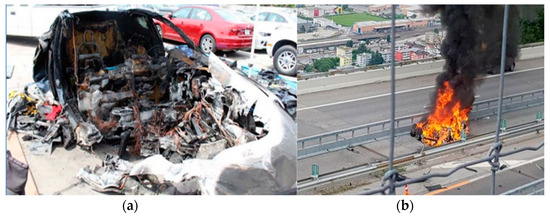 First fires of mass-produced battery electric vehicles (BEVs) (a) 2 October 2013, (b) 7 Novembre 2013 [41,44].