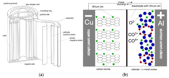 The concept of a Li-ion battery is based on the movement of electrical charge in the form of lithium ions between the anode and cathode through electrolyte. Li-ion batteries are most commonly produced in four types of cells: cylindrical, prismatic, coin, and pouch cells [57]. A typical single cylindrical Li-ion battery, e.g., 18,650, is constructed as a multi-layer spiral. There is a layer of an anode, a separator (PTFE), a cathode, a separator and in between them in a sealed housing an electrolyte. Schematic representation of the structure and operation of a Li-ion battery is shown in Figure 4a,b.