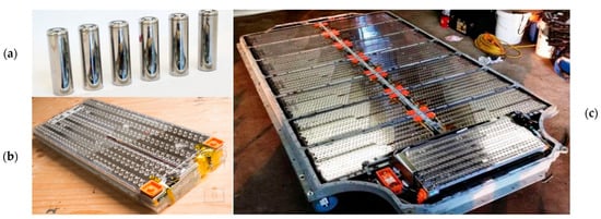 In recent years, the automotive industry has mostly used Li-ion batteries of the NMC type (e.g., VW, GM, Toyota, Audi, Porsche, Fiat, Nissan, BMW), NCA type (Tesla, Daimler), and LFP type (Byd) for the production of electric batteries [71]. BEVs are equipped with Li-ion batteries that consist of modules, which in turn consist of individual cells of different shapes connected in parallel and series. The most common are cylindrical, pocket and prismatic shaped cells. Figure 5 below shows the single cylindrical cells used in the Tesla S and a module consisting cylindrical cells and an entire traction battery consisting of modules [72].