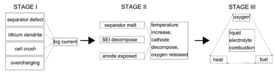 The thermal runaway phenomenon leading to the initiation of fire in Li-ion batteries can be divided into three stages (Figure 6). The first stage starts with an increase in temperature of the Li-ion battery that may be caused by exceeding the rated cell voltage (overcharging), exposing the Li-ion battery to excessively high temperatures, external short circuits caused by faulty wiring, or internal short circuits caused by defects in the battery, mechanical damage (penetration of the cell interior by metal fragments), formation of lithium dendrite during overcharging of the battery at low temperatures, flawed separator. Stage one ends when the LIB exceeds its normal operating temperature range due to rising temperature [81]. During the second stage the increase of the internal temperature of the cell is accelerated and exothermic reactions occur inside the battery such as: decomposition of the electrolyte (SEI), which occurs roughly at temperatures above 90 °C accompanied by the release of flammable gases and oxygen; further decomposition of SEI and increase of temperature causes the reaction of metallic or intercalated lithium in the anode with organic solvents contained in the electrolyte, during which flammable gases (ethane, methane and other hydrocarbons) are released and the temperature increases further. Above approximately 130 °C, the polyethylene (PE)/polypropylene (PP) separator melts, resulting in short circuits between the cathode and anode. Finally, the temperature (about 180 °C e.g., for LiCoO2) causes decomposition of the cathode material and the release of oxygen, which is also highly exothermic which further accelerates the increase of temperature. The heat escaping process moves from stage 2 to stage 3 as soon as sufficient oxygen and heat have accumulated to burn the battery. During stage 3 the combustion of the electrolyte begins, the electrolytes used in LIBs are usually organic, which are highly volatile and flammable [74,81,82,83,84].