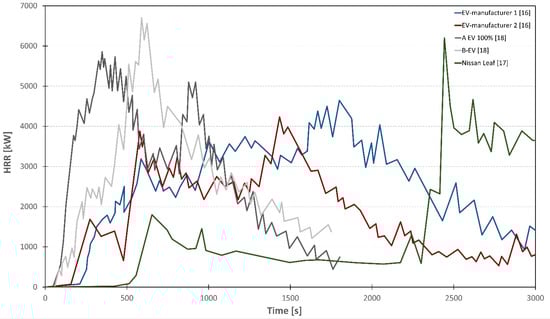 Heat release data for electric vehicle (EV) fire tests [16,17,18].