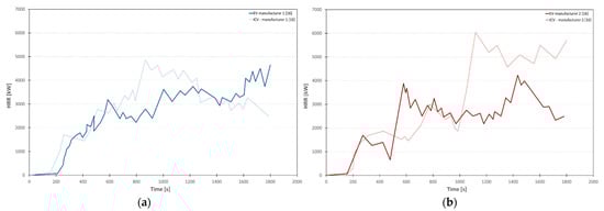 The HRR fire development curves used for comparison are shown in Figure 9a,b for the test involving a small passenger car of manufacturer 1 with a mass of 1122 kg and a compact passenger car of manufacturer 2 with a mass of 1501 kg, respectively [16].