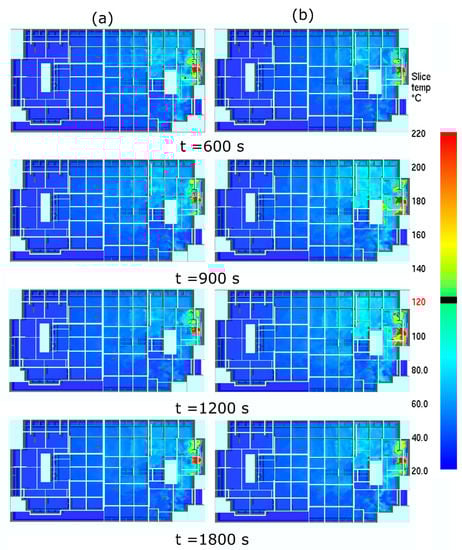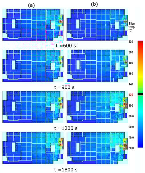 The results are presented as visibility distributions at a height of 1.8 m above the floor, allowing the course of conditions prevailing during the evacuation to be assessed in minute intervals for the first 5 min of the fire development (60 s, 120 s, 180 s, 240 s, 300 s) [105,106], the temperature prevailing on the paths to the fire source at a height of 1.5 m above the floor at the time of reaching the maximum power of the fire, allowing the actions of fire-fighting and rescue teams [104] and temperature under the ceiling of the room to be evaluated for reaching the maximum power of the model fire PHRR, showing the impact of the fire on the building structure. In Figure 10, Figure 11, Figure 12, Figure 13, Figure 14 and Figure 15 in the left column are presented the results for an electric EV and in the right column for an ICEV.