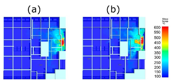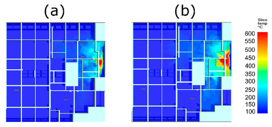 CFD analysis result—temperature distribution at a height of 1.5 m above the floor during firefighting and rescue operation (a) EV (b) ICEV, manufacturer 1.