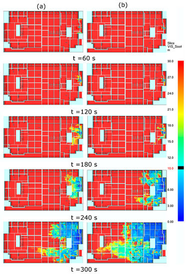 Computational fluid dynamics (CFD) analysis result—visibility distribution at a height of 1.8 m above the floor during evacuation (a) electric vehicle (EV) (b) ICEV, manufacturer 1.