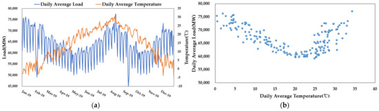 The electric load characteristics according to temperature: (a) the daily interval-valued electric load and temperature in 2019; (b) the scatter plot of daily temperature and electric load in 2019.