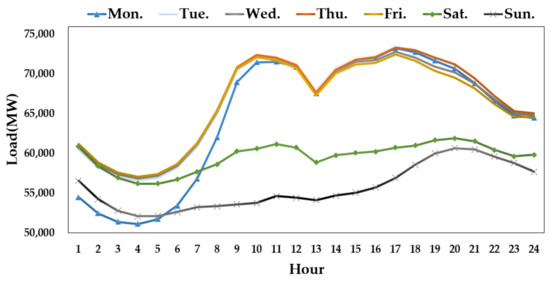 Electric load changes periodically according to calendar factors (such as seasons, day of the week and holidays) and is affected by exogenous factors (such as economic, population and weather). For accurate load forecasting, it is necessary to analyze the relationship between electric load and exogenous variables. In the short term, the electric load is highly related to weather factors and calendar factors. The weather factor that is known to have the greatest impact on electric load is temperature [11,16]. Changes in temperature have a very large impact on heating and cooling energy consumption. In addition, the electric load shows different patterns depending on the characteristics of the day (such as weekdays, weekends and holidays). In South Korea, the proportion of electrical energy consumption in the industrial sector is high [5]. On weekdays, when industrial production is active, electrical energy consumption is higher than on weekends. In the case of Monday, the electric load before noon is lower than that of other weekdays due to the influence of the previous day—Sunday. The electric load characteristics, according to exogenous variables, are shown in Figure 1. Figure 1a shows the daily interval-valued average load and the average temperature in 2019, presenting the periodic change in electric load according to the season. Figure 1b shows a scatter plot of daily average temperature and peak load in 2019, indicating a high positive or negative correlation, or a low correlation, depending on the temperature range. Figure 2 shows the average load pattern by day of the week in 2019, which is largely classified into Monday, Saturday, Sunday and weekdays, except for Monday.