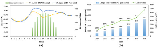 The volatility of electric load: (a) difference in electric load between a sunny day and a cloudy day in spring; (b) the capacity statistics of solar PV generator and the difference in electric load between a sunny day and a cloudy day by year.