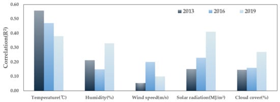 As the penetration rate of BTM solar PV generators increases, the correlation between weather factors and electric load is also changing. In the past, the weather factor that had the greatest influence on electric load was temperature. However, the correlation between temperature and electric load is decreasing due to the distortion of the electric load caused by the amount of BTM solar PV generation. On the other hand, for solar radiation and cloud cover—which are highly related to the amount of solar power generation—the correlation with electric load is increasing. The correlation between electric load and weather factors by year is shown in Figure 4.