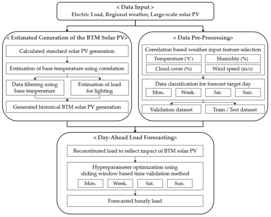 Many existing load forecasting studies have limitations in that they do not systematically reflect the impact of the BTM solar PV generation. Even in the case of studies reflecting the impact of BTM solar PV generation, it is extremely rare that the capacity of BTM generators for the entire power system is estimated and case studies are performed on the actual power system. In the proposed algorithm, day-ahead load forecasting is conducted by considering the amount of BTM solar PV generation. The contributions of this paper are the following: