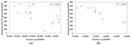 Scatter plot of electric load and standard solar PV generation in the autumn of 2019: (a) days filtered by the KMA base temperature range (18–26 °C); (b) days filtered by the estimated base temperature range (12–19 °C).