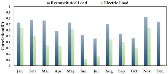 The reconstituted load is calculated by adding the amount of BTM solar PV generation to the electric load. The comparison of the correlation between electric load, reconstituted load and temperature in 2019 are shown in Figure 8. The correlation between the reconstituted load and temperature is higher than the correlation between electrical load and temperature.