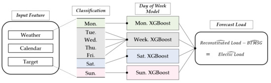 XGBoost is a tree-based model that branches data according to input features and uses the branched data for prediction. If the historical electric load used as the training dataset is different from the day of the week of the target date, it affects the performance and learning time of the model. Therefore, we propose a day-of-week (DoW) model that classifies the training data according to the forecast target date. The load forecasting process of the DoW XGBoost model is shown in Figure 9.