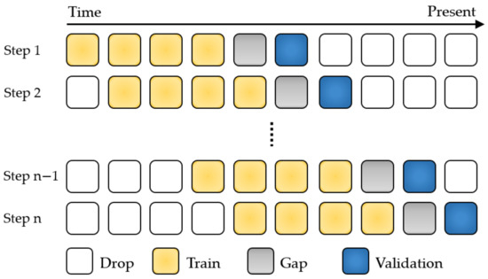 The load is one of the time series data and forecasted using historical data. Therefore, the time series validation method is used for hyperparameter tuning. In the proposed load forecasting algorithm, the training data is updated every timestep (1 day) to continuously reflect the trend of the load. For this, the sliding window-based time series validation is used among cross-validation methods [14]. When load forecasting under real conditions, it is difficult to use the data of the forecasting performed day. Therefore, the gap of one day is placed between validation and training. A grid search is used for hyperparameter tuning, and the parameter with the lowest MSE for the validation dataset is selected. The sliding window-based time series validation method is shown in Figure 10, and the main parameters of the XGBoost algorithm are shown in Table 2 [33].