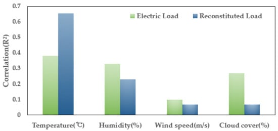 The weather prediction factors published by the KMA are temperature, humidity, wind speed and cloud cover [27]. The weather input features used for load forecasting are selected through correlation analysis between load and weather factors. Figure 11 shows the comparison of the correlation between electric load, reconstituted load and weather factors in 2019. In the case of electric load, it can be seen that there is a high correlation with temperature, humidity and cloud cover. On the other hand, in the case of reconstituted load, it was confirmed that the correlation with temperature increased and the correlation with the remaining weather factors decreased.