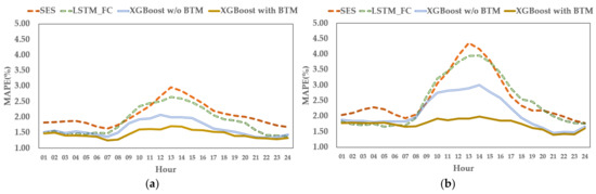 The day-ahead load forecasting simulation is performed using 630 days excluding holidays in 2019 and 2020 as test data. For example, when load forecasting is performed on 10 January 2020, the hourly electric load on 11 January 2020 is forecasted. In this case, data used as input are data up to 9 January 2020. During the simulation period, load forecasting is performed every day for 630 days excluding holidays, and a total of 630 × 24 h of electric load value is forecasted. In addition, the estimated capacity of BTM solar PV generators increased monotonically from 7900 MW in January 2019 to 13,300 MW in December 2020. To analyze the performance change, according to the penetration rate of BTM solar PV generator, the accuracy is compared by year. In addition, to verify the accuracy improvement through the reflection of the BTM solar PV generation, the error is analyzed by time. Figure 12 and Figure 13 show the MAPE of the forecasting methods by year.