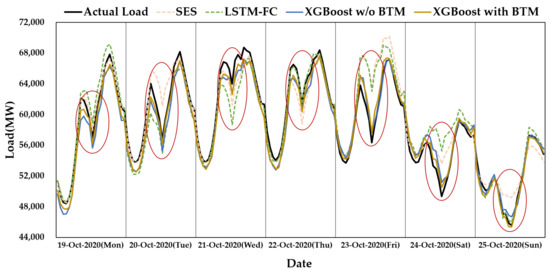 Figure 14 shows the results of the forecasting methods for the week of October 2020. October is autumn, and the electric load is lower than in winter and summer because the heating and cooling energy consumption is small. Accordingly, the impact of the amount of BTM solar PV generation on electric load becomes relatively large. The red ellipses in Figure 14 show the daytime load forecasting results. The proposed method, XGBoost with BTM, can reflect the amount of BTM solar PV generation, so the daytime residual is small, but other forecasting methods confirmed that the residual was large. As the amount of BTM solar PV generation increases, electric load and electrical energy consumption differ, causing distortion of electric load. This distortion of electric load causes the peak and valley loads to shift in time. Peak load refers to the highest electric load during the day, and valley load refers to the lowest electric load during the day. The summary of errors of load forecasting by the forecasting methods during the simulation period is shown in Table 5.