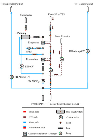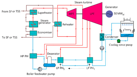 PTPP is modelled in detail using process control components (e.g., turbine, pump and heat exchanger) as well as various automation components (e.g., controller and analogue modules) and electrical components. Several thermal-hydraulic models can be implemented to model the process components, describing the steady-state and dynamic performance of a single-phase flow or a two-phase flow. Numerous approaches for modelling the single-phase and two-phase flow in a PTPP can be seen in the published literature [39]. Such control systems include several components, such as regulators, analog, and digital binary components, combined together to provide specific system control needs. The electrical components can be used to evaluate the impact of potential failures in the electrical grid on the power system. In addition, the energy demand of process components in steady-state and transient operation conditions can be calculated [40].