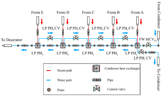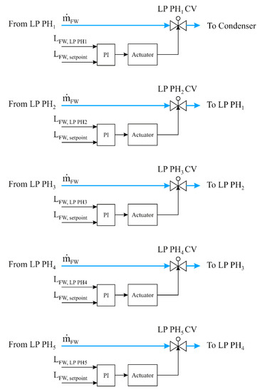Changes in the levels of the shell side for the LP preheaters are caused due to steam extractions from the turbine. Therefore, these levels of condensed water in the shell side are controlled using fife LP preheaters control valves (LP PH1 CV1—LP PH1 CV5). The locations of the LP preheater control valves are illustrated in Figure 4. The operation mode of LP PH level control circuits can be described in the three steps as follows: