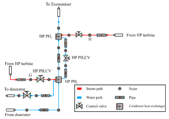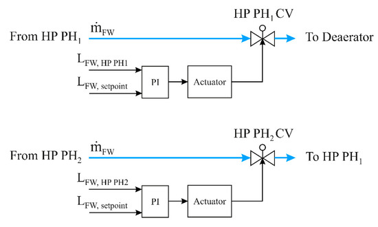Similar to what happens in LP preheaters, some oscillations occurred in the HP preheaters due to condense the steam extractions in the shell paths of these preheaters. The HP preheater level controllers keep the water levels in the shell side at constant values. Hence, there are two HP preheater control valves (HP PH1 CV and HP PH2 CV) that regulate the levels of water in the shell side. The locations of the HP preheater control valves are demonstrated in Figure 6. The operation mode of HP PH level control circuits is similar to the operation mode of control valves in the LP preheaters.