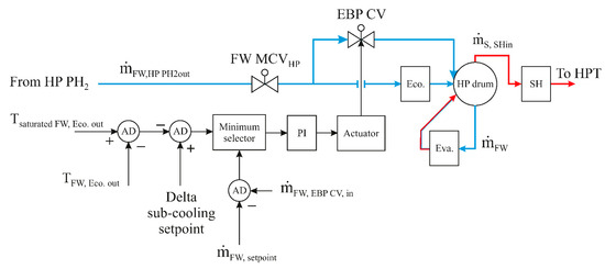 During the start-up and the hard steam turbine transient, the mass flow rates at the entrances and the exits of the evaporators are highly deflected. It is clear that the water swelling in the HP evaporators is involved. However, in the case of small drum volume, the incoming/outcoming mass flow rates oscillation produce drum level fluctuations. During the dynamic process, the HP drum controller follows the level fluctuations in the drum in order to regulate the feedwater mass flow coming to the HP drum and to maintain the water level at a preset value. The procedures of this controller can be divided into three cases depending on three operating periods (i.e., normal load, shutdown and start-up periods). The feedwater coming to the drum is adjusted using the HP feedwater main control valve (FW MCVHP). This control valve is installed between HP PH2 and the economisers, as demonstrated in Figure 7.
