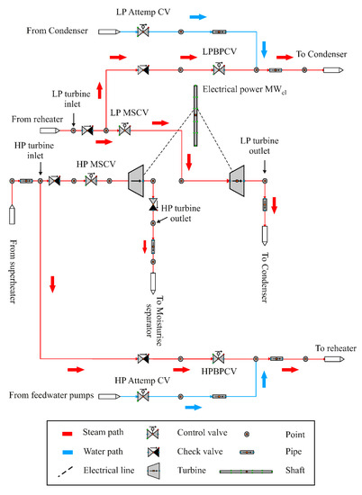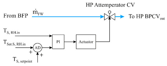 An HP attemperator controller was built to provide cooling of the bypassed steam downstream of the HP BPCV to 50 °C higher than the saturated steam temperature before entering the reheater. This cooling process is achieved by the water, which is pumped from the boiler feedwater pump (BFP) into the HP BPCV outlet, as demonstrated in Figure 14.