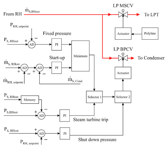 LP bypass control circuit contains two control valves, as displayed in Figure 11 and Figure 12. The LP main steam control valve (LP MSCV) adjusts the flow to the LP turbine. It is controlled by a time gradient (polyline). During standard operation, the HP-MSCV must be opened, and during the start-up phase, it must be closed. The LP bypass control valve (LP BPCV) is operated using a summation rule. In this case, the two control functions are to be performed in two different ways. On the one hand, the undesired steam must be diverted to the condenser. On the other hand, the second task is that the reheated steam pressure must be regulated to a certain setpoint pressure initially, with a maximum pressure that must not be exceeded. Moreover, when the steam turbine trip occurs, LP BPCV is operated to bypass the entire steam. The high pressure main steam control valve HP MSCV is operated in the same way as the (LP MSCV) by a time gradient (polyline).