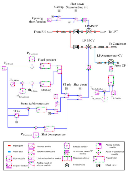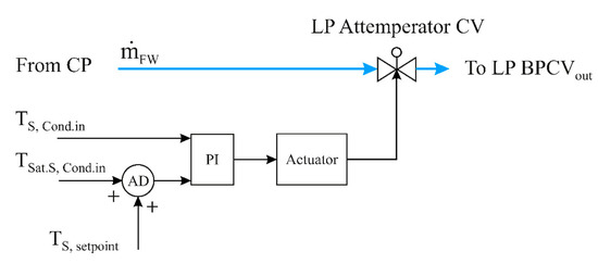 An LP attemperator controller was modelled to cool the bypassed steam after the LP BPCV, as shown in Figure 13. This cooler cools the bypassed steam to 50 °C higher than the saturated steam temperature before it enters the condenser. It should be mentioned here that water coming from condenser pump (CP) is used in the LP attemperator.