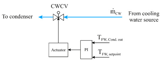 The condensed water temperature at the condenser outlet is recorded and checked against the set point (37 °C). This comparison is implemented by a PI controller that sends the control signal to the actuator, which in turn operates the CWCV.