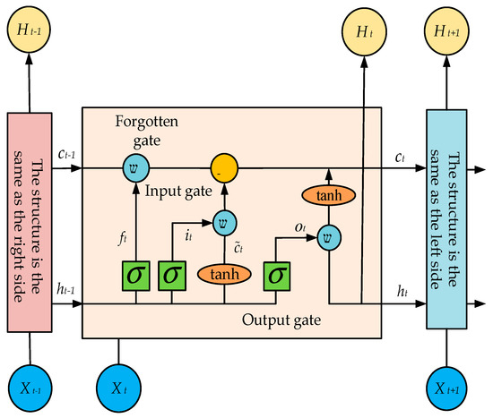 Equation (2) controls the “forgotten” information of the current neuron from the previous neuron, implemented by the Sigmoid layer known as the “forgotten gate”, σ , which is an activate function known as a Sigmoid function. W f , b f are the weights and thresholds of the forgotten gate, respectively. The forgotten gate works by reading the last neuron’s output, h t 1 , and the current neuron’s input, X t , entering a value between 0–1 and multiplying with the previous cell state c t 1 . If the output is 1 multiplied by c t 1 , representing the previous cell state information, this is a “memory neural network”. If the output is 0 and multiplied by c t 1 to represent the previous cell state information, this is completely “forgetting”. In this way, the long-term memory of the network model is guaranteed. Equations (3) and (4) together control the input of cells. Equation (3) is implemented by the Sigmoid layer called the “input gate”. After the input gate reads the output h t 1 of the previous neuron and the current neuron input X t , it outputs a quantity of 0–1, i t . In Equation (4), a new candidate vector c ˜ t created by a layer tanh can obtain the current cell state c t of Equation (5) through c t 1 , f i , i t . W i , W c are the weight matrix of the input gate and the candidate value, respectively; b i , b c are the corresponding bias values.
