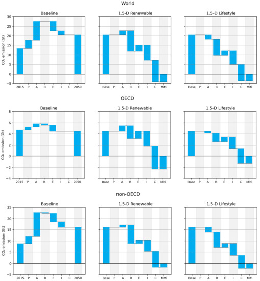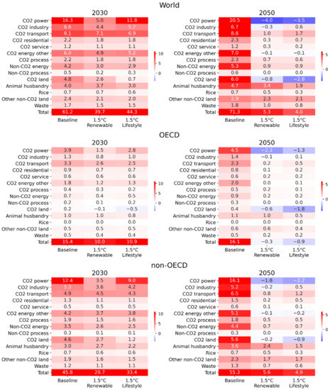 Figure 2 also shows the decomposition analysis between the Baseline scenario and the 1.5 °C scenarios. The 1.5 °C Renewable and Lifestyle scenarios show substantial (−4 and −3.5 Gt CO