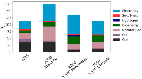 The global energy mix of industry in the baseline and the two 1.5 °C scenarios. (sec. heat = secondary heat).