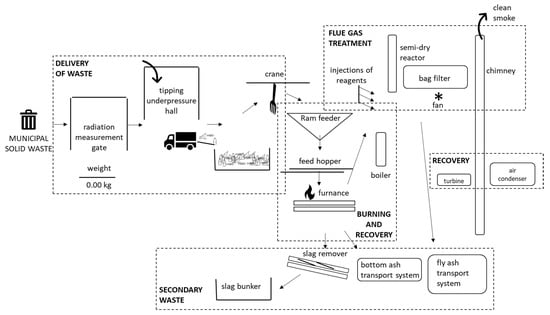 Secondary waste. In this zone, the waste generated during the process is collected. MSWIBA (19 01 12—European Waste Catalogue number) is collected, which is then subjected to a valorization process, which is described in detail in [8]. Fly ash (19 01 07 * European Waste Catalogue number, the “*” means hazardous waste) is loaded into barrels and taken to the site where it undergoes the stabilization/solidification (s/s) process and is then stored in the form of monoliths. Boiler ash is a waste product, which, depending on the installation, is, e.g., added to fly ash and disposed of together with it [8,9]. Figure 3 shows the incineration plant scheme with treatment zones [10].