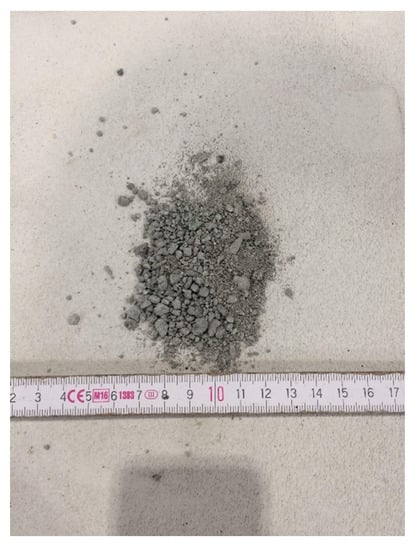 Bottom ash has the code 19 01 12 (bottom ash and slag other than those mentioned in 19 01 11). The test sample is the 0–8 mm fraction. The waste is grey. It is not dusty or dirty. It has no characteristic odor. The figure shows the tested bottom ash [8]. Figure 5 represents MSWIBA.