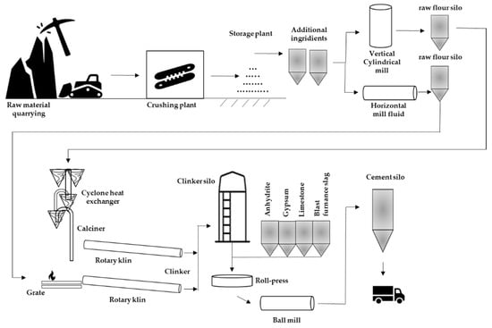 Portland cement is a mineral hydraulic binder. The raw materials for clinker production are limestone, marl limestone, marl, and clay. The firing temperature of the raw materials reaches 1450 °C. The flame and gas temperatures are about 2000 °C. The material in the high-temperature zone stays for about 0.5 h. High temperatures make the clinker firing process an energy- and emission-intensive process. In addition, natural resources are consumed in cement production [19,20,21]. Figure 6 shows the production of Portland cement.