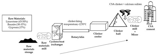 Calcium Sulfoalumine Cement (CSA) is a mineral hydraulic binder. CSA is formed after the milling of sulphate clinker and calcium sulphate. The main constituent is (Ca4(AlO2)6SO4/C4A3S) [22]. Figure 7 shows clinker and CSA production scheme.