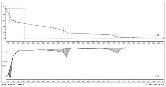 DTG analysis was performed in the temperature range 25–1600 °C in an air atmosphere. Losses of mass for the analyzed samples were determined, and the onset, endset, and peak were determined on the DTG curve [23].
