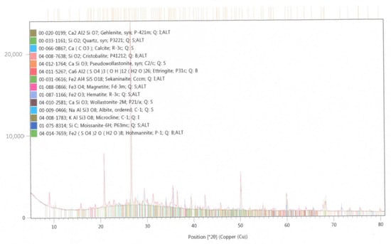 An ingredient that exhibits hydraulic properties after appropriate activation and, in order to be used in cement, must meet the requirements of EN 197-1:2012 [N4.2], the most important of which are glassy phase content ≥67%, CaO + MgO + SiO2 oxide sum content ≥67%, and CaO + MgO/SiO2 mass ratio ≥1 [27]. Figure 9 shows glassy phase of MSWIBA.
