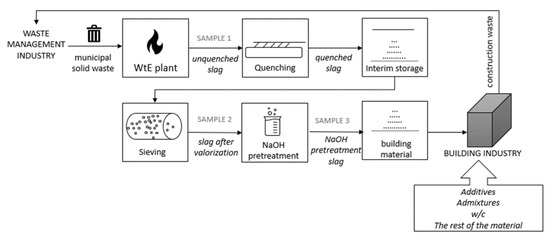 The next research step could be to analyze both wastes, i.e., fly ash and MSWIBA. Such a combination will make it possible to take advantage of the slag’s SCM characteristics, which will increase the immobilization of contaminants from the hazardous fly ash. Fly ash is the most burdensome waste from waste incineration plants, while it also has pozzolanic characteristics and therefore has potential for use in construction [35,36,37].