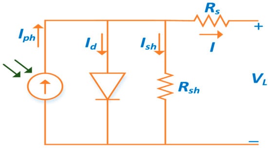 Figure 1 shows the circuit model of a single diode PV cell. Using Kirchhoff’s Current Law (KCL), the output current, , of the model is calculated as [43]