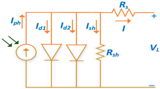 where are the saturation currents. and are the diode ideality factors of the respective diodes. It is evident from Equation (7) that the DDM has seven unknown parameters ().