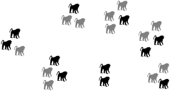 Fission-fusion social groups of bonobos. Light figures are females; dark figures are males.